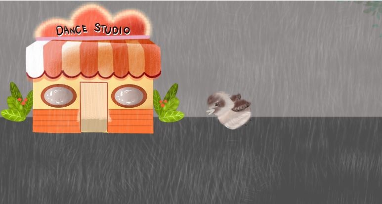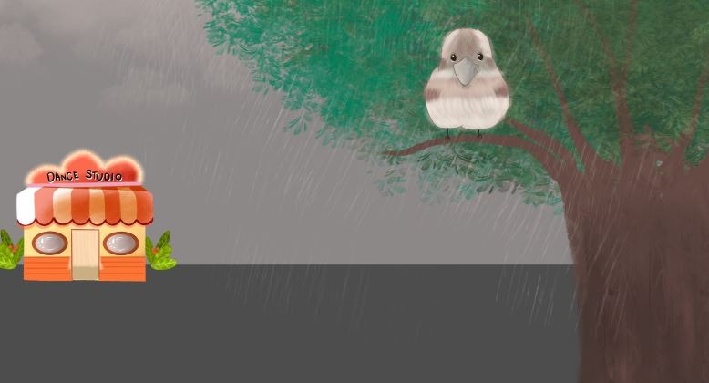 Looking for shelter, the bird spots a cozy dance studio nearby.